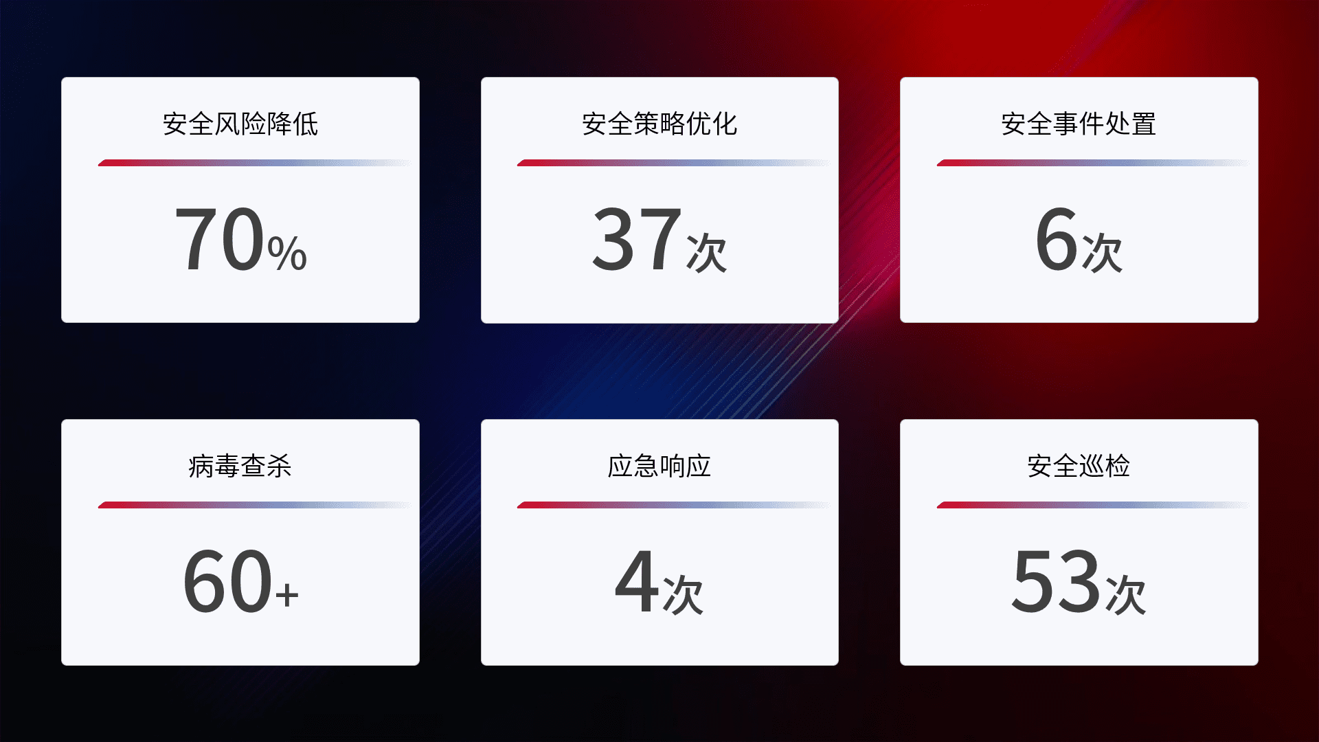 提供全面的安全事件报告体系,,,包括处置报告、、、、周报、、、、季度和年度总结,,结合持续监控,,帮助客户深入了解网络安全状况。。。