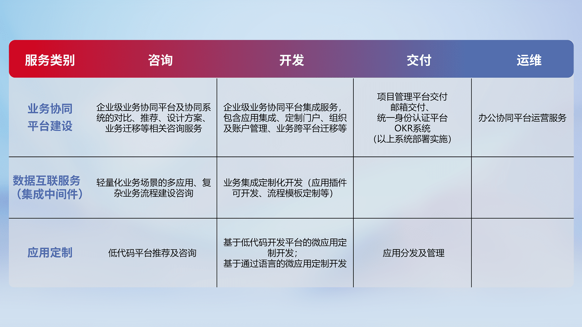针对钉钉、、企微、、、、IDaas等平台级产品提供产品的规划、、、方案、、交付、、定制化开发等服务,,,实现如统一协同办公、、、、智能客户服务、、、、混合会议管理、、、、智能数据查询、、、、等业务场景,,,实现数字化转型。。。。